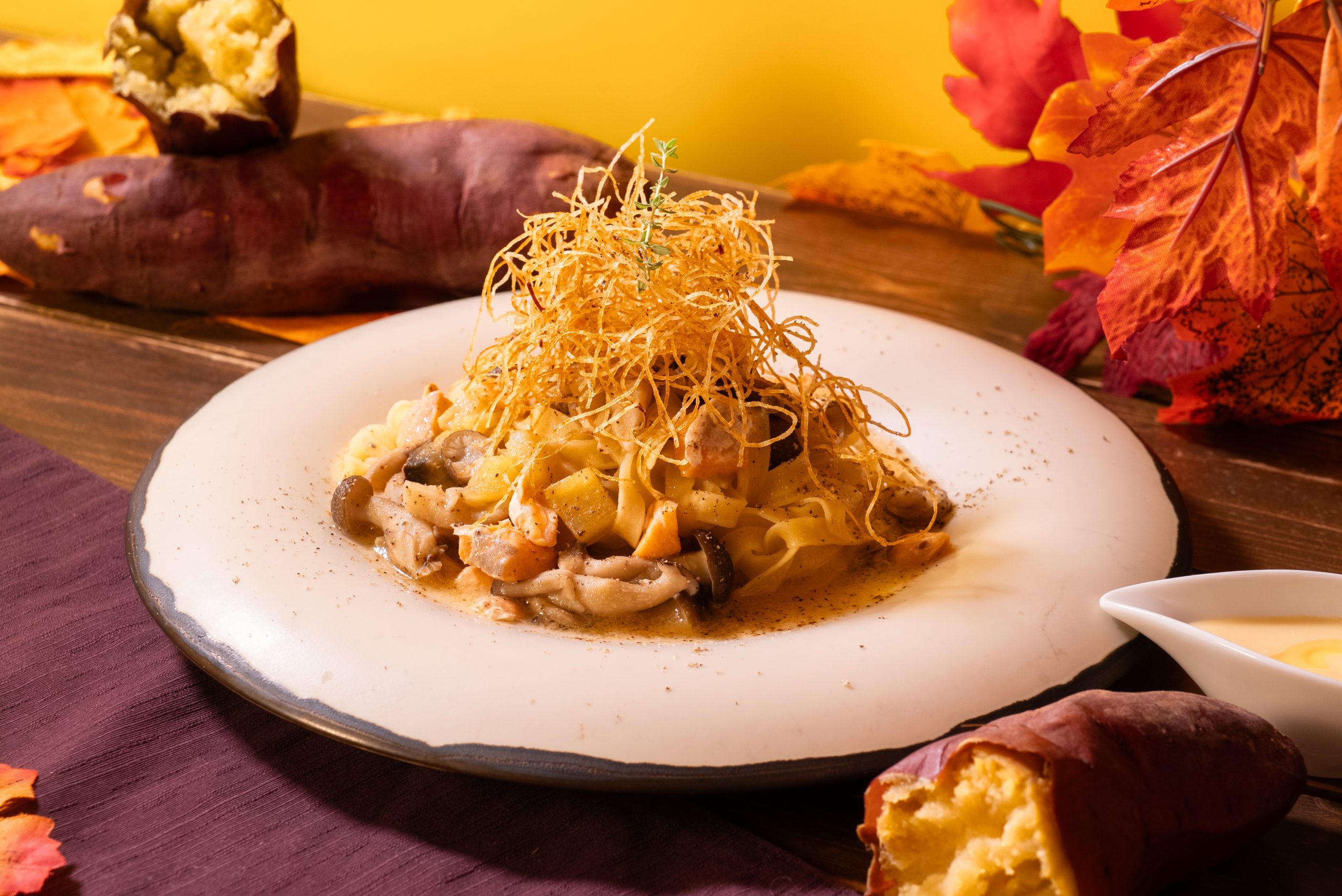 秋の食材、鮭としめじに川越芋を加えて和風パスタに仕上げました。