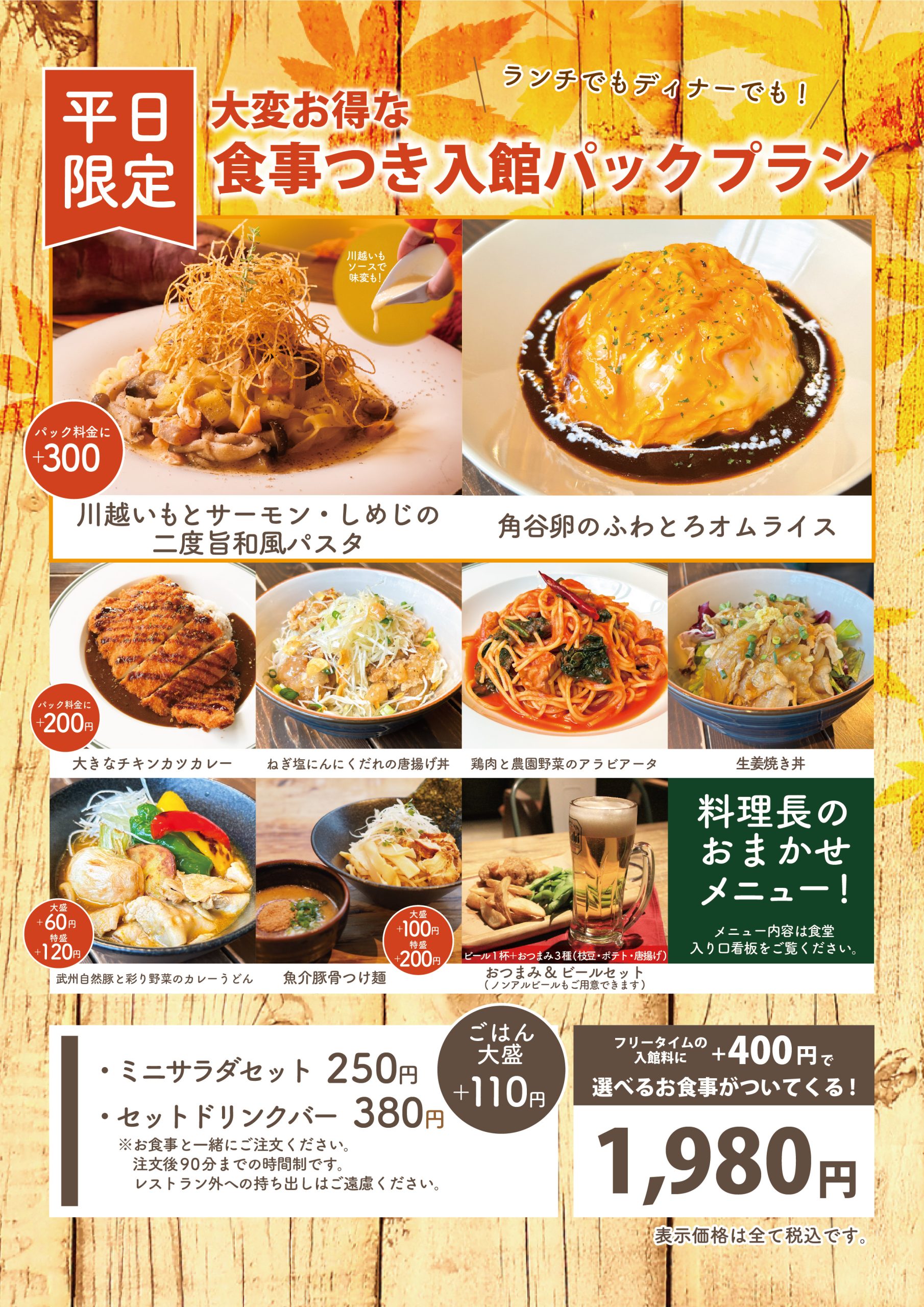 秋メニューの川越いもを使用したパスタから平日パックでしか食べられないメニューも。ぜひこの機会に、いろんなメニューを食べてみてください。